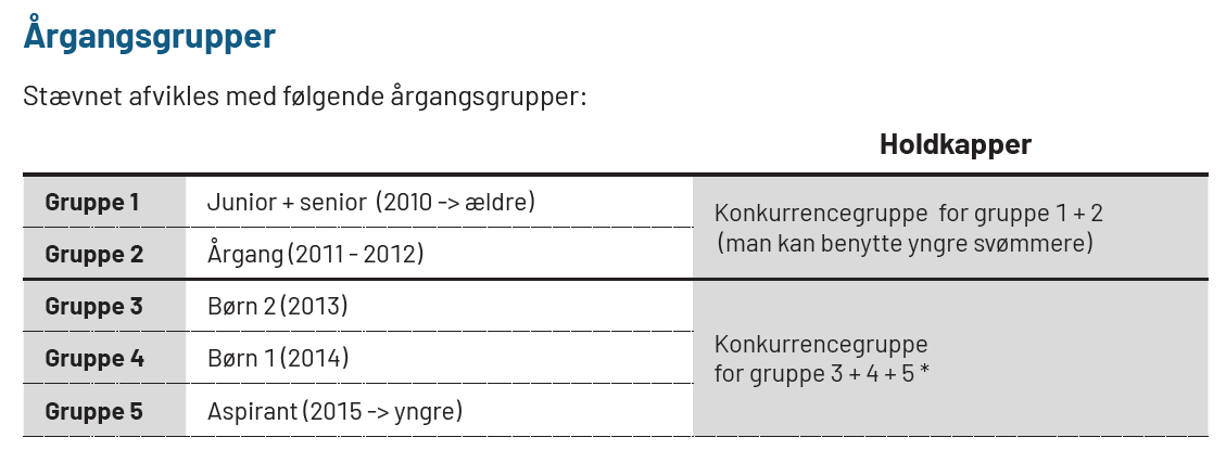 OBS: K-trænerne vælger løb med konkurrencesvømmerne (MS2, G3, G2 osv), så det er kun svømmere fra Aquachamp, Minimasters og MS1 som skal ønske løb ved tilmelding. Ønsker man at svømme holdkapper, så noterer man det som en kommentar ved tilmelding.