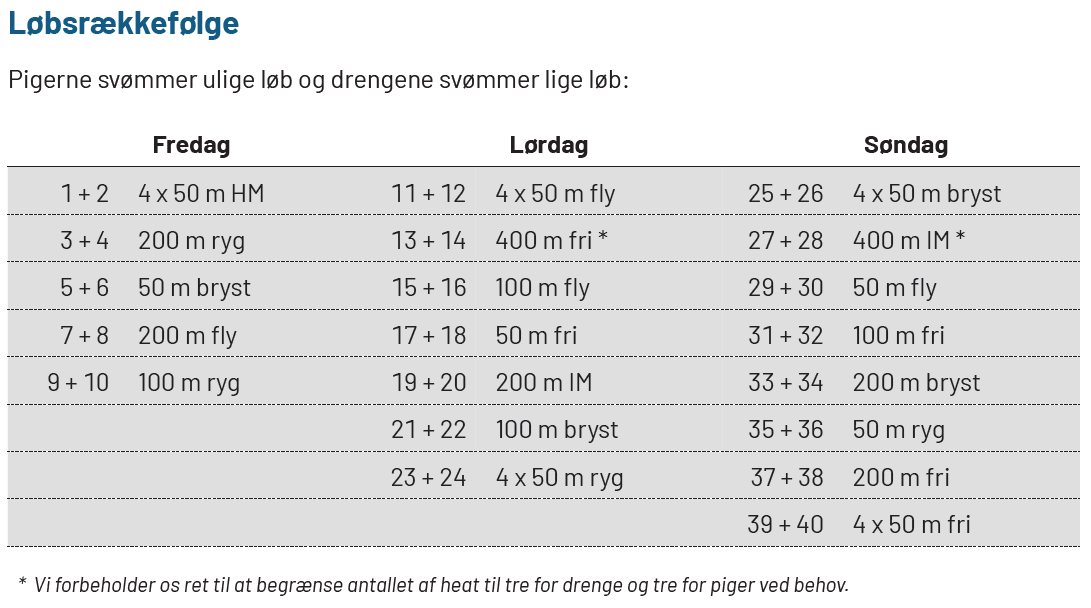 Information about the meet, such as the meet invitation, schedule, results, etc., can be found on svømmetider.dk here (note that the registration deadline on svømmetider is for coaches): Svømmetider | Gentofte Sommerstævne 2026
